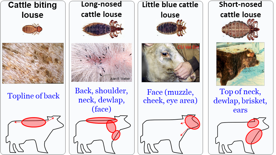 Sucking lice feed off blood sucked from the capillaries which can cause more serious production problems including anemia. There are three species of sucking lice, the long-nosed cattle louse, the little blue cattle louse, and the short-nosed cattle louse. Sucking lice are typically found along the head and shoulders of affected animals.