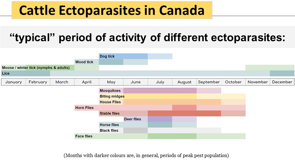 The life cycle of each pest determines when they are active throughout the year. The timing of adult activity overlaps for several types of pests, so producers should be aware of what pests are present in their region. The timing of pest activity can vary throughout the day. Some pests are active at the same time, and cattle can be irritated by several different parasites simultaneously, causing a substantial change in behaviour and production losses. Also, some types of pests are active at different times of the day (and night), and animals may have little rest from parasite pressure.