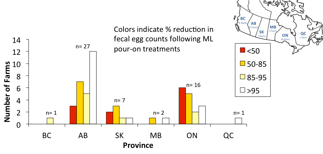 Le graphique montre le pourcentage de réduction du nombre d’œufs d’ascaris à la suite d’un traitement à l’ivermectine ou à la doramectine dans environ 50 troupeaux de bovins de boucherie au Canada. Des échantillons fécaux ont été prélevés sur 20 veaux du troupeau avant le traitement par pulvérisation et 2 semaines après le traitement par pulvérisation et le comptage des œufs fécaux a été effectué. Les différentes barres colorées indiquent le nombre de troupeaux dans chacune des catégories suivantes : réduction inférieure à 50 %, 50-85 %, 85-95 % et supérieure à 95 % du nombre d’œufs fécaux après le traitement. D’après cette étude, nous savons que les parasites des vers ronds internes ne sont pas bien contrôlés chez les bovins de boucherie canadiens et que la majorité des charges parasitaires détectées étaient suffisantes pour causer probablement des pertes de production.